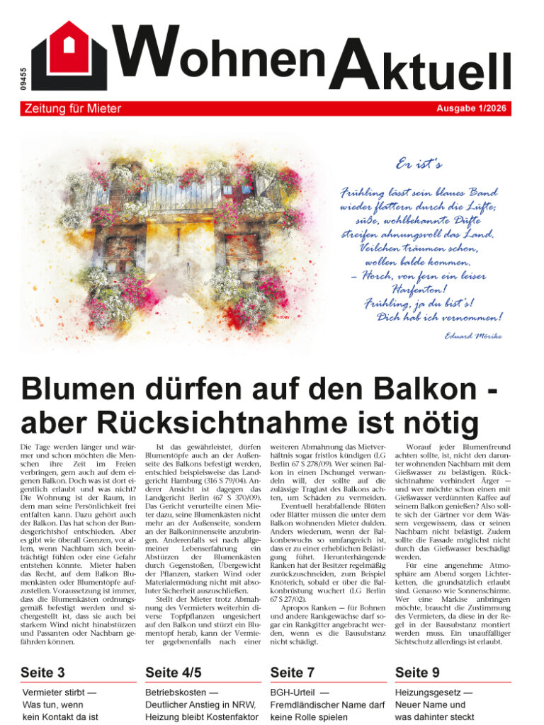 Unsere Mieterzeitung „WohnenAktuell“ erscheint vierteljährlich und berichtet über Neuigkeiten aus unseren Mietervereinen, aktuelle Themen aus der Wohnungspolitik, Meinungen und Ziele des Deutschen Mieterbundes sowie Buntes und Unterhaltsames. Mitglieder erhalten unsere Mieterzeitung kostenlos per Post oder als E-Paper per Mail.